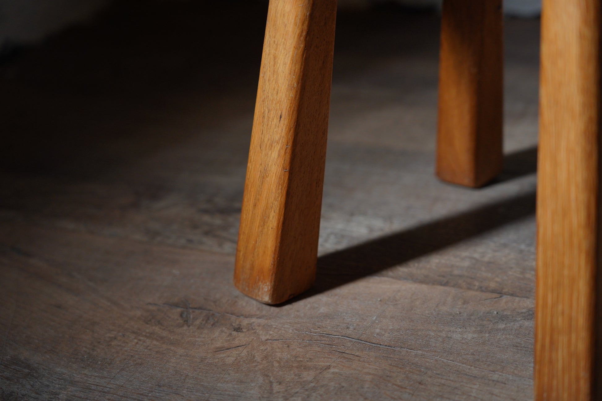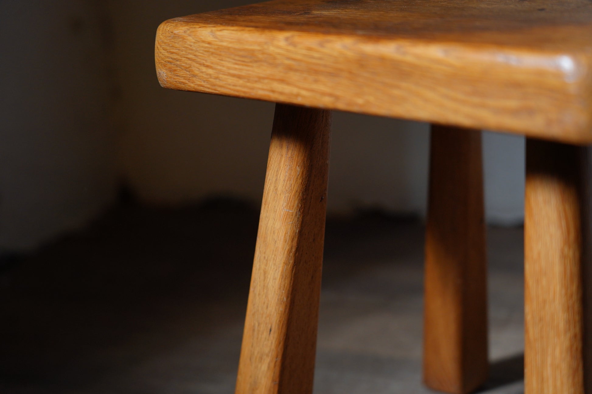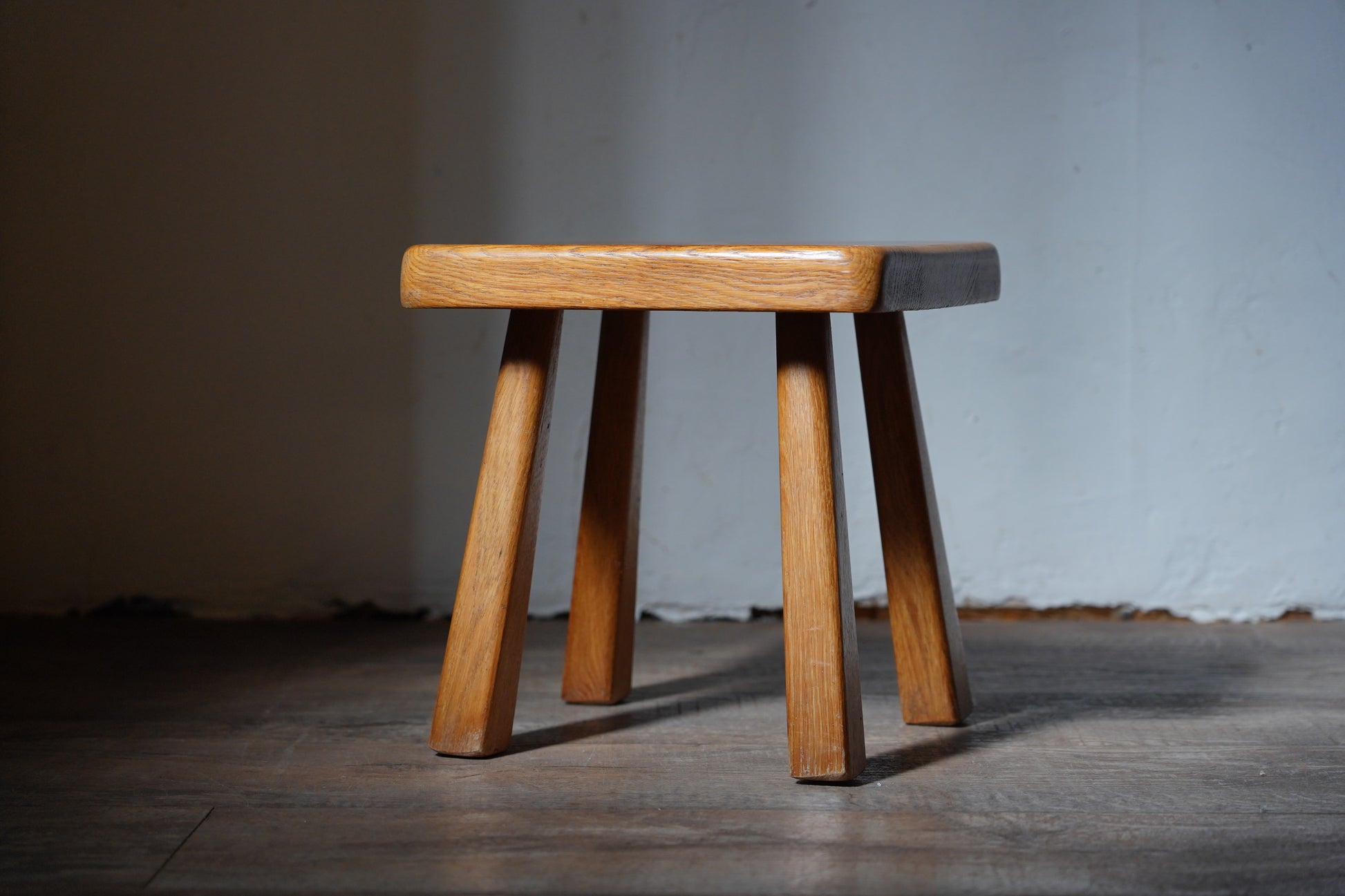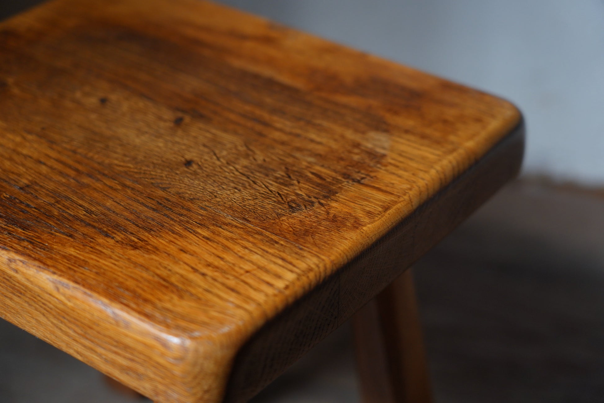 厚みのある1枚板の座面と、ナチュラルなカラーや末広がりな足元が朗らかな印象です。