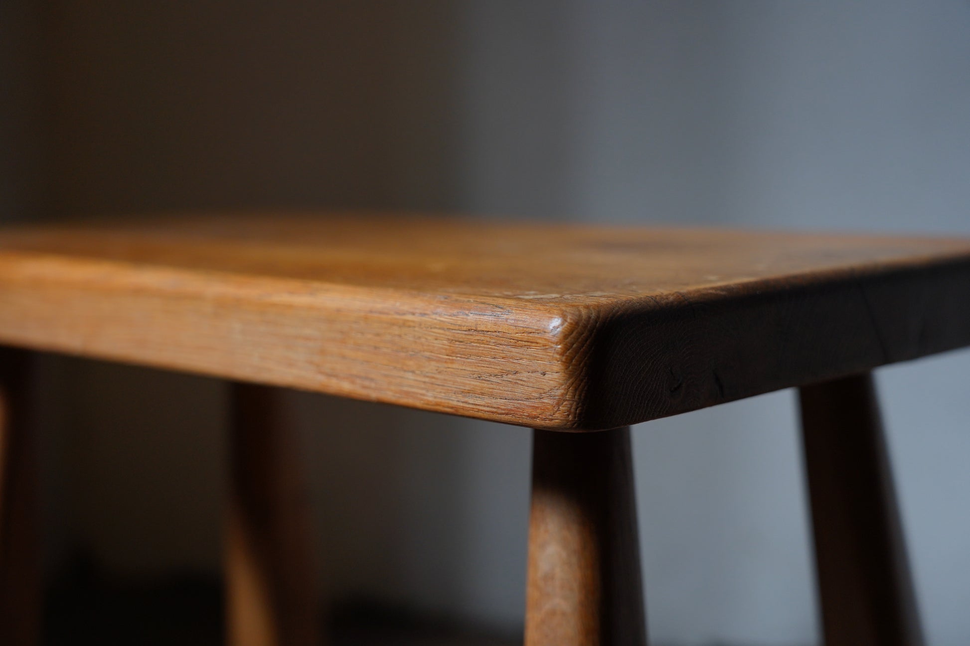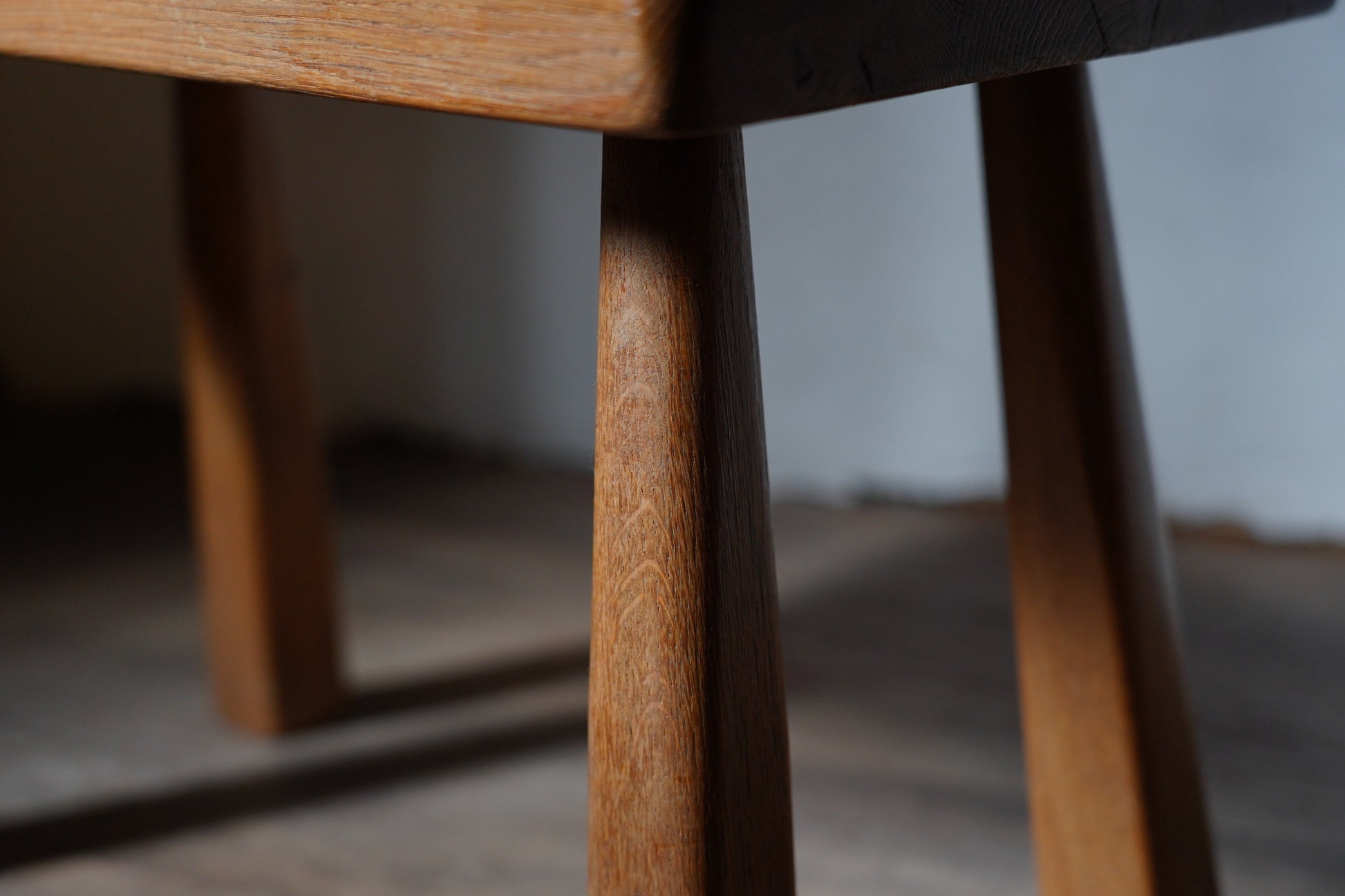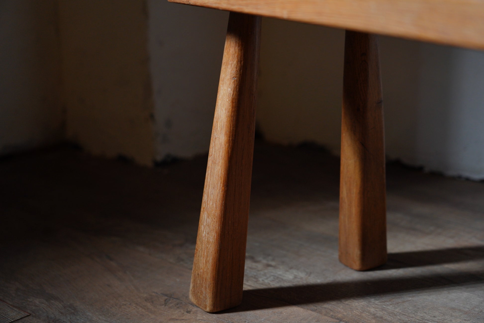 厚みのある1枚板の座面と、ナチュラルなカラーや末広がりな足元が朗らかな印象です。