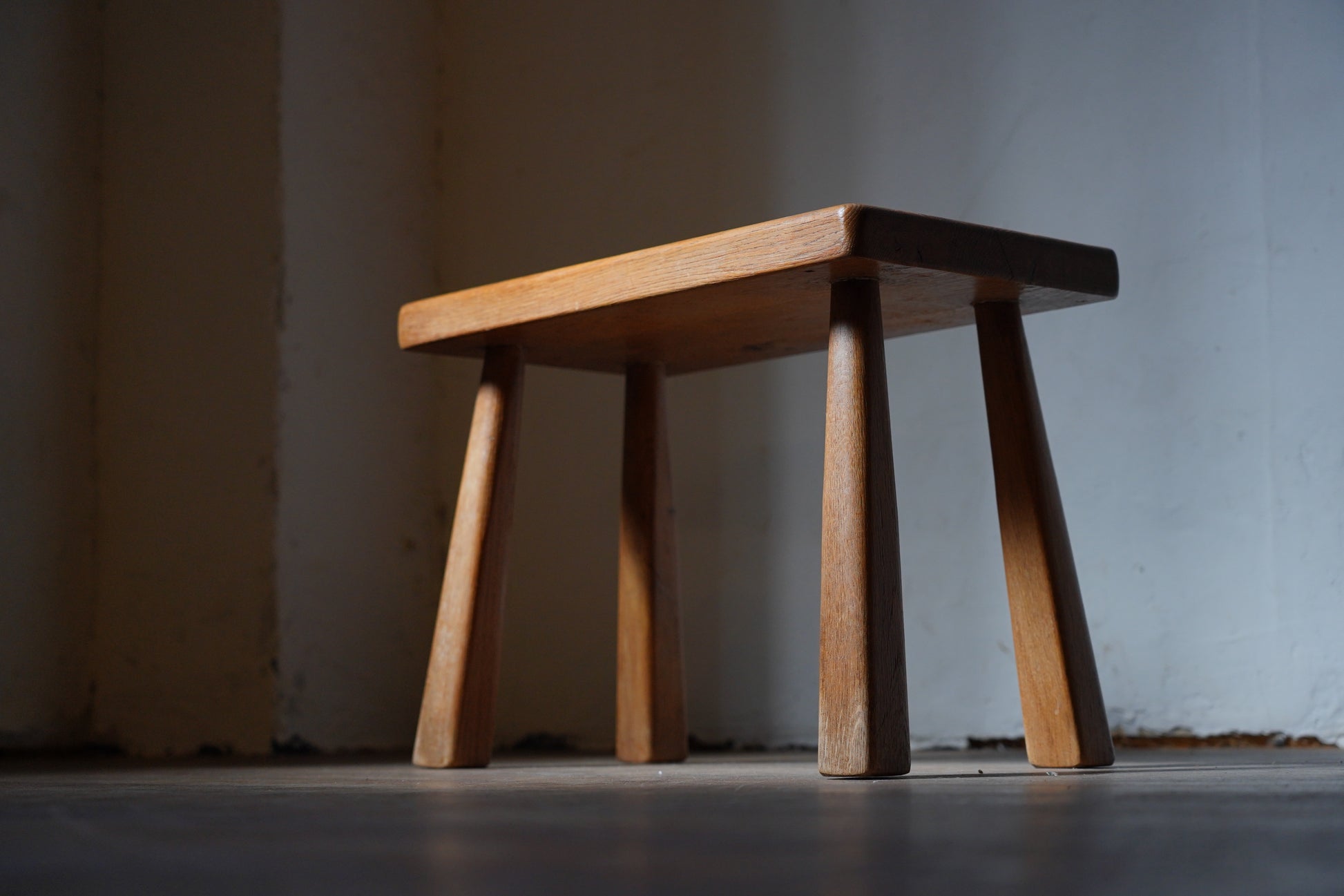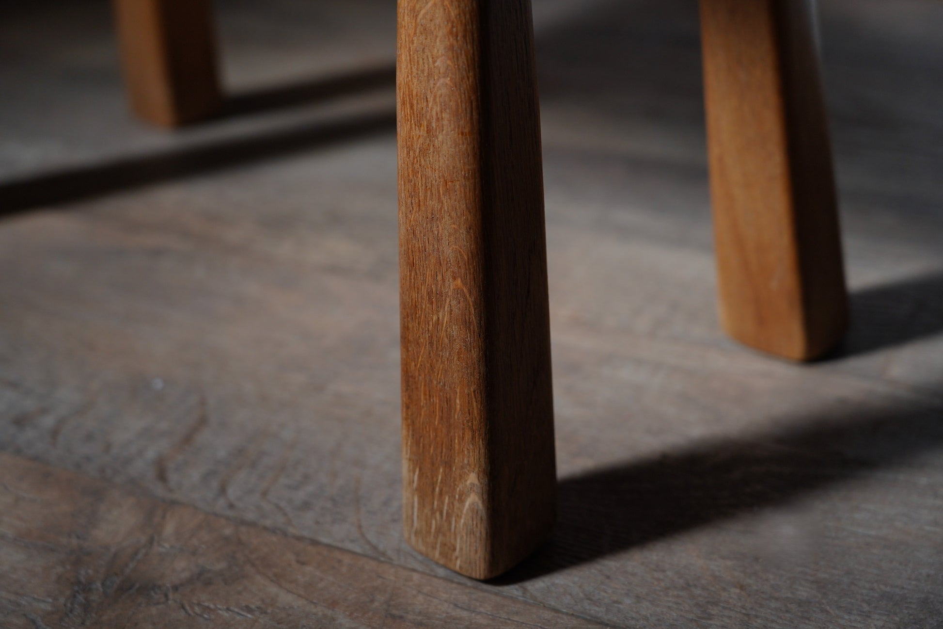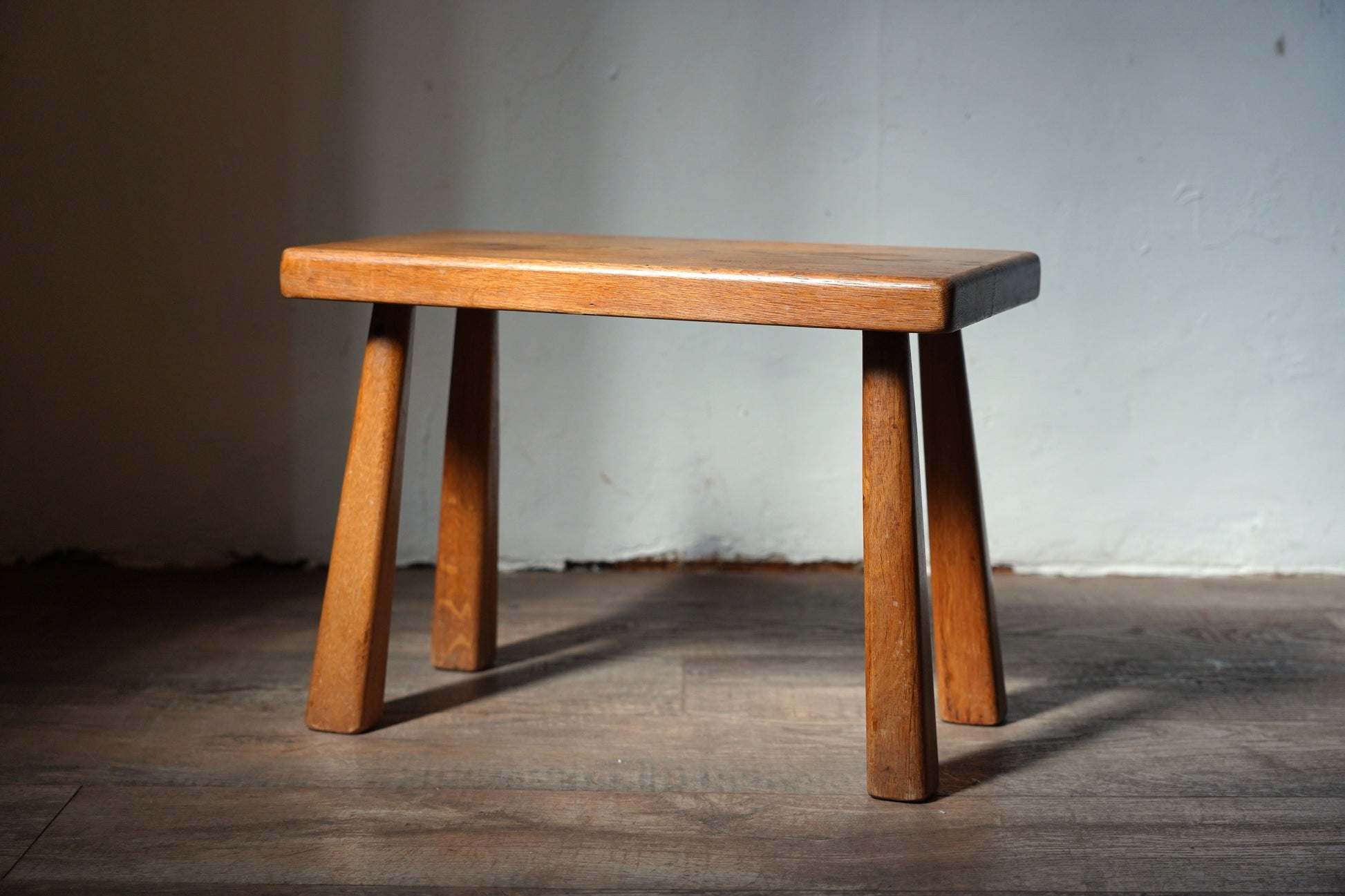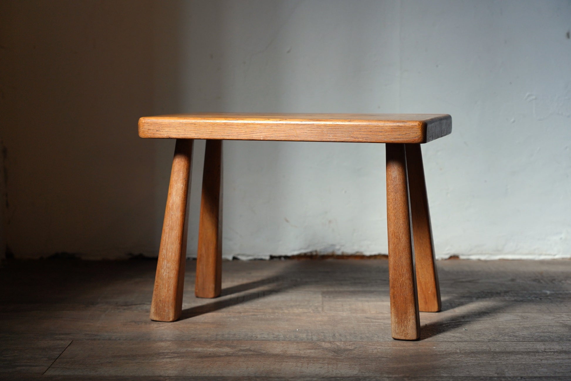 厚みのある1枚板の座面と、ナチュラルなカラーや末広がりな足元が朗らかな印象です。