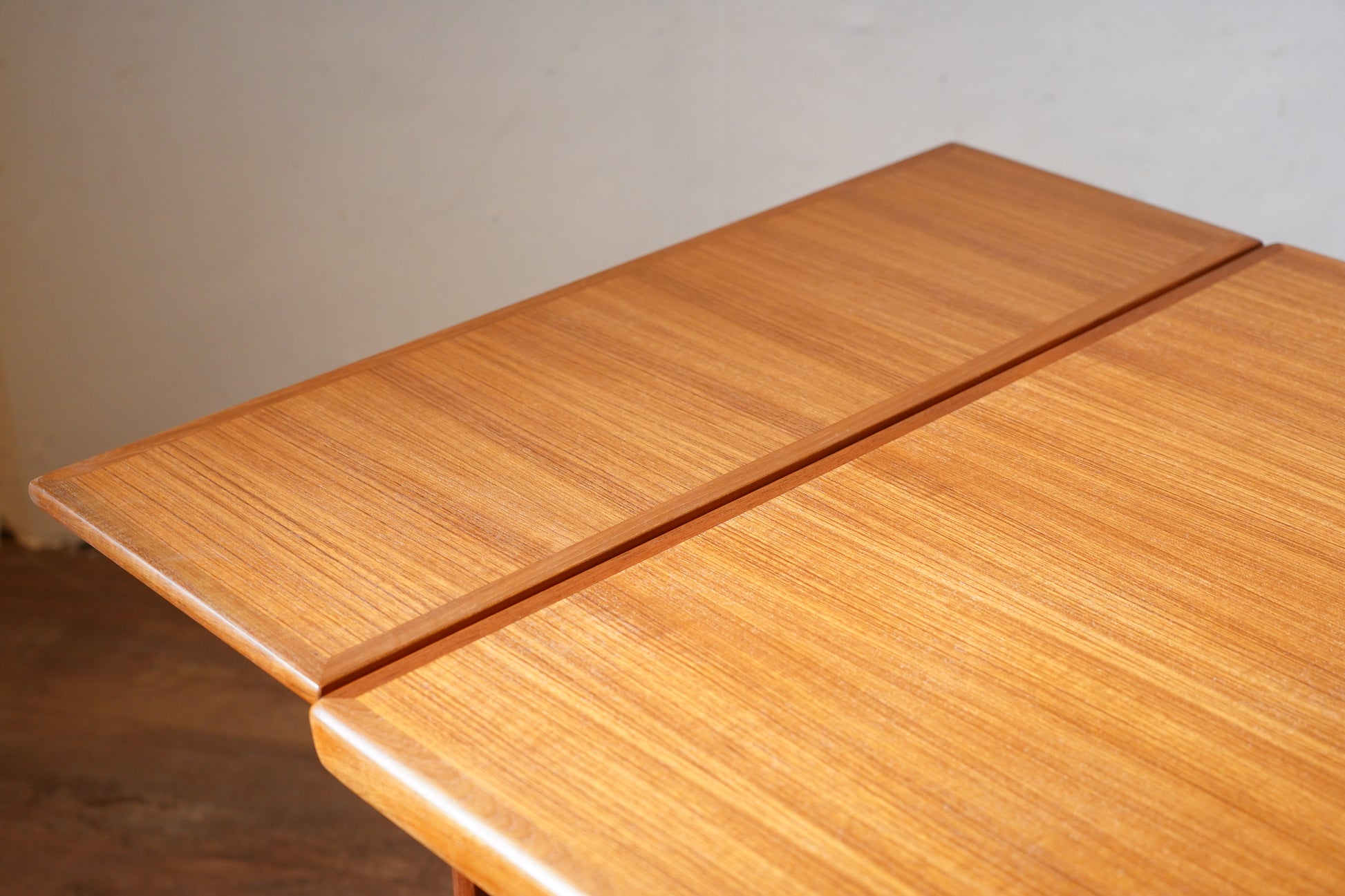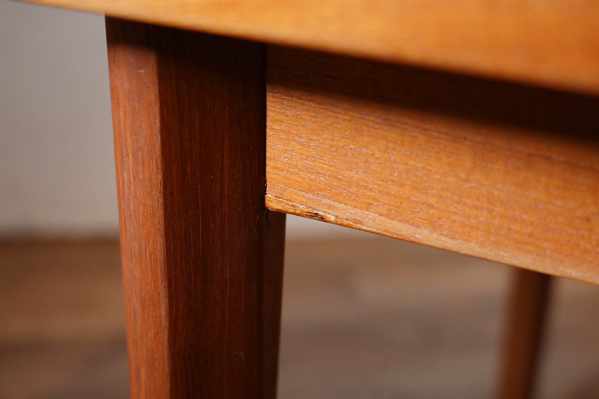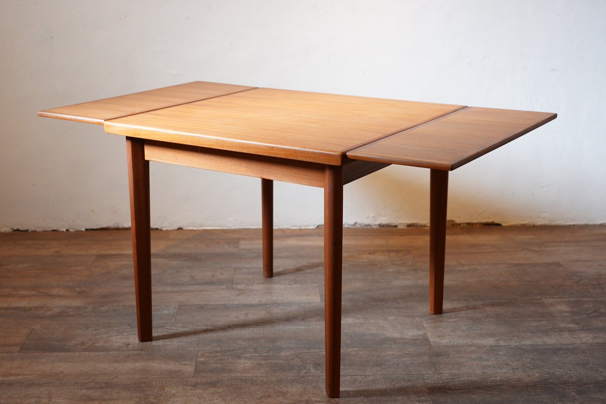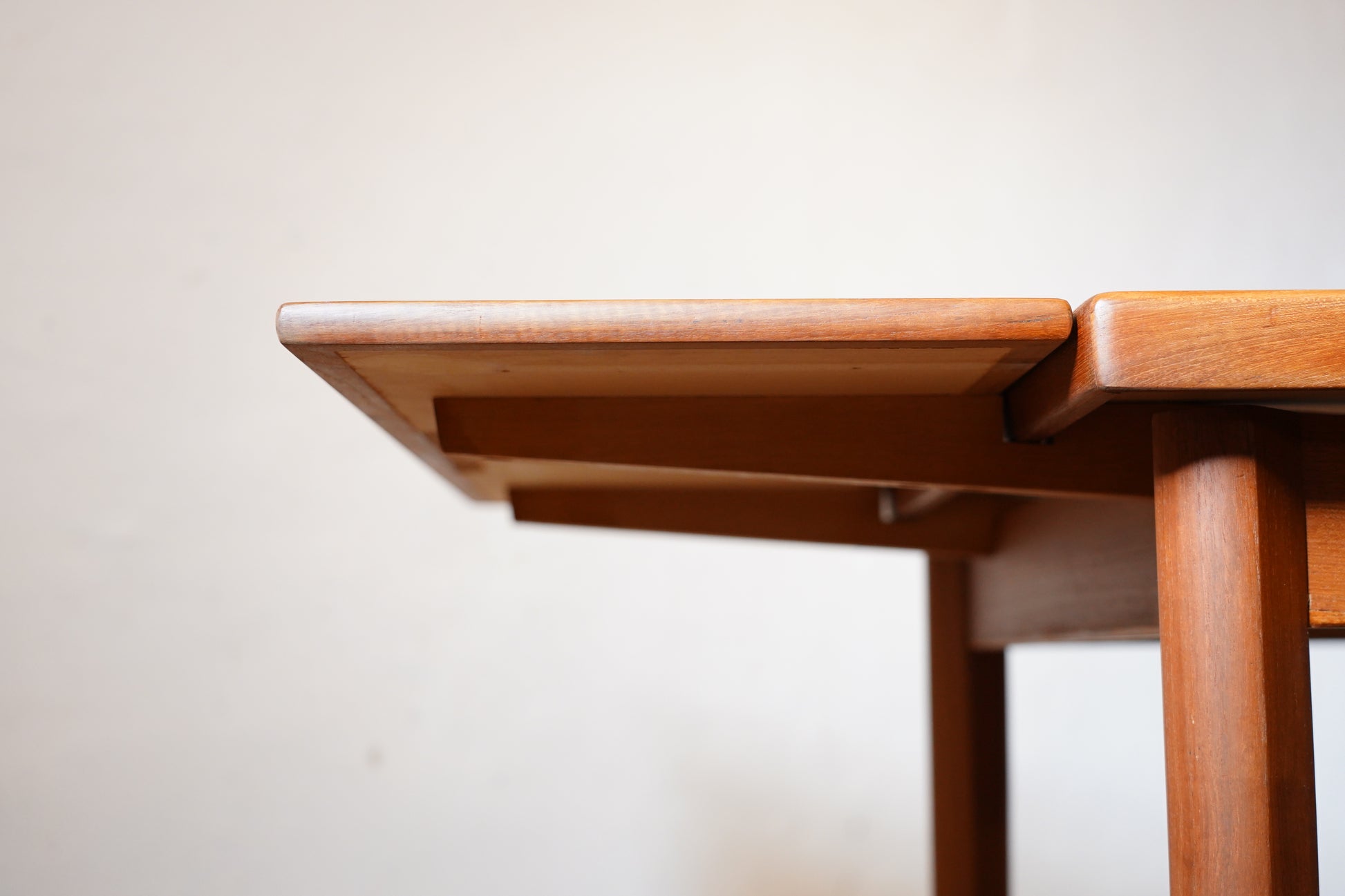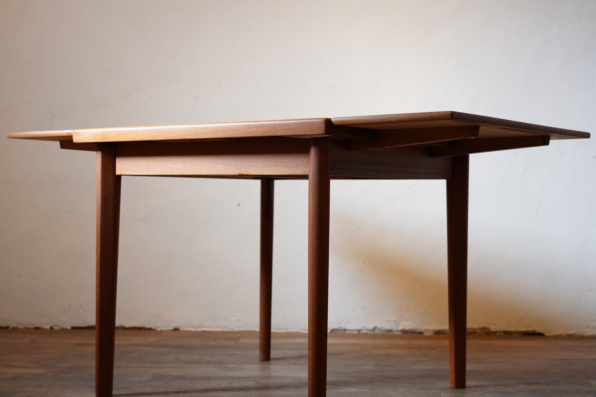 とろみのあるチークの木肌が美しく、両サイドから内部に収納された板を広げて、天板のサイズを大きくすることが出来るドローリーフテーブルです。