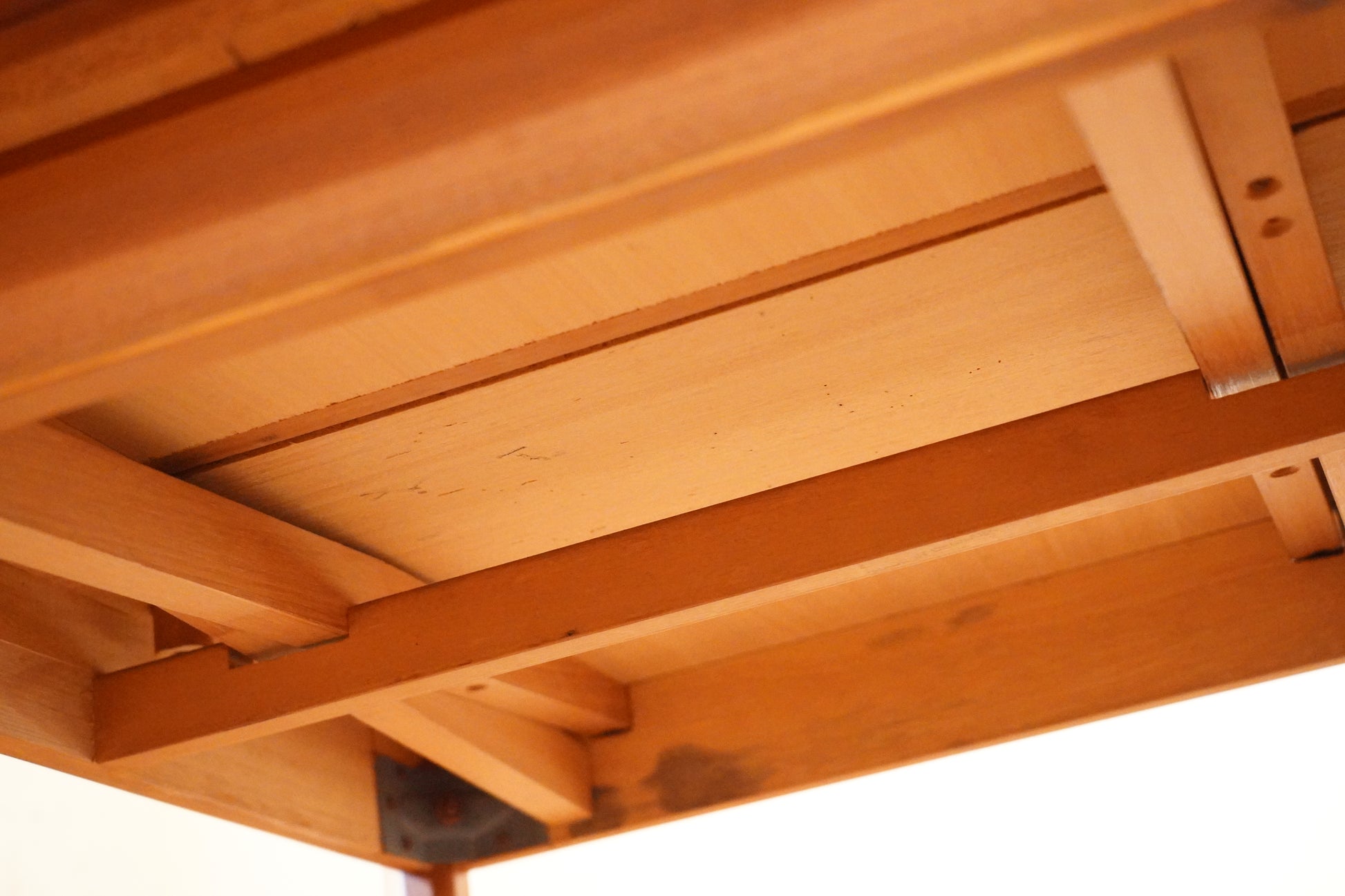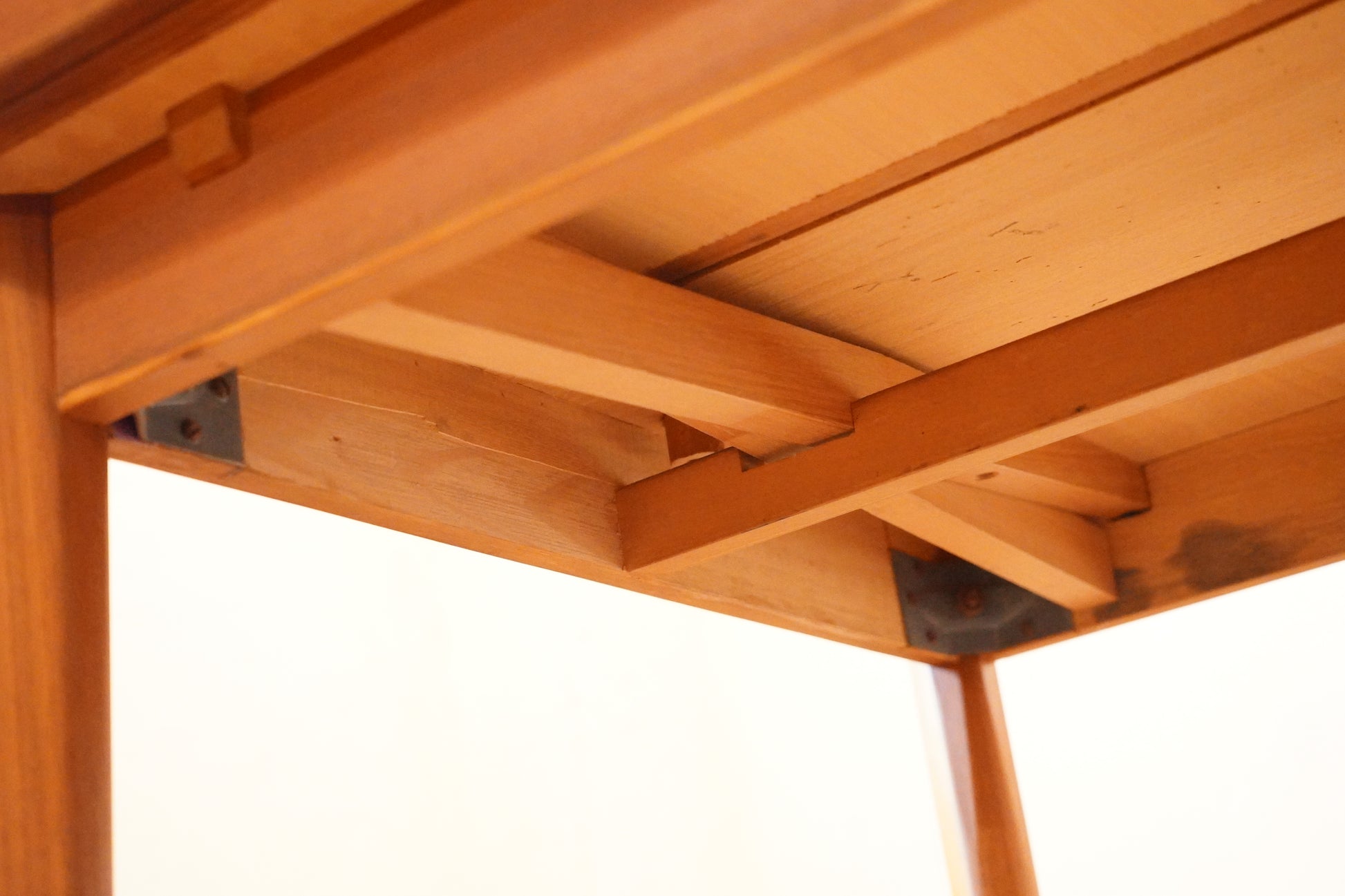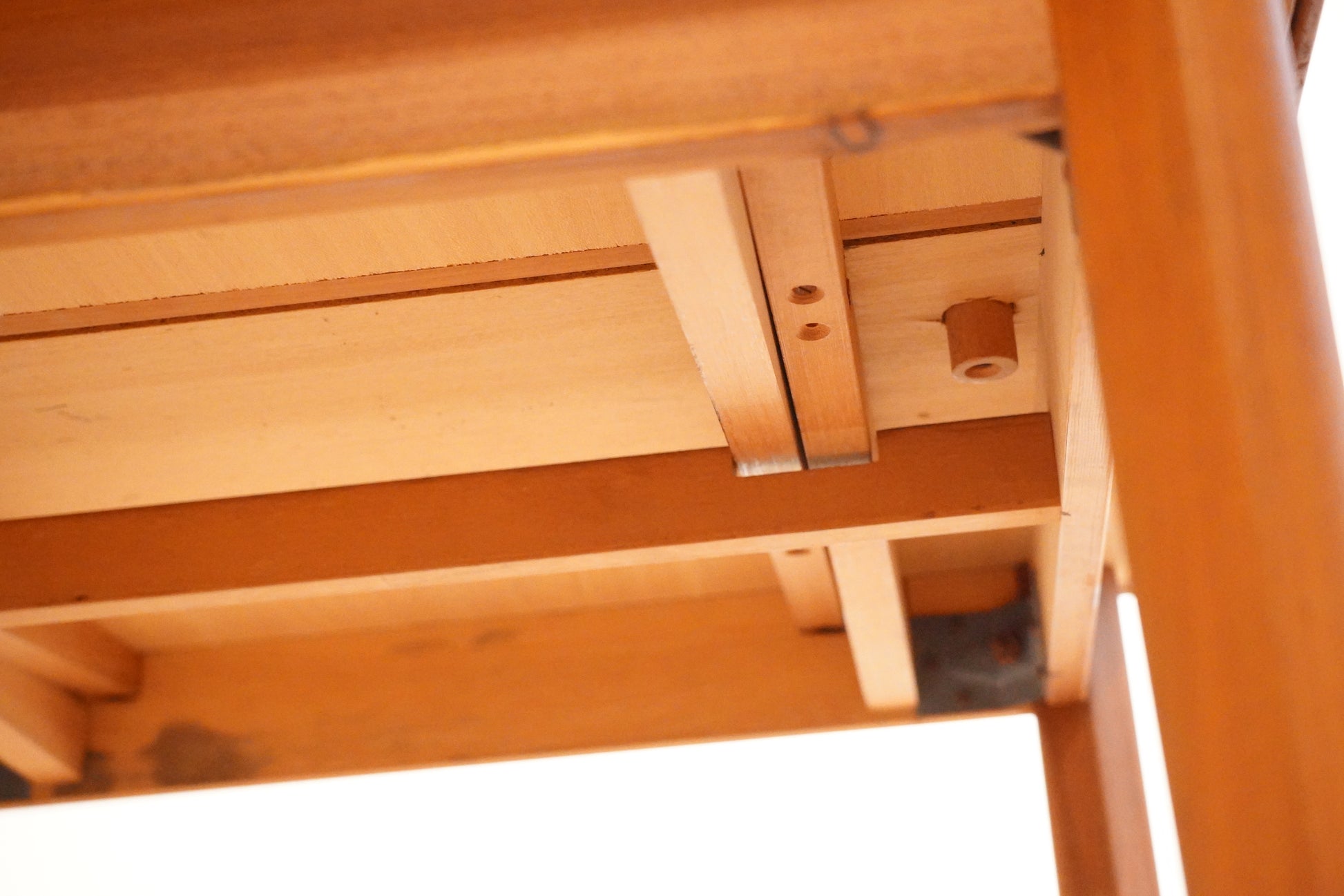 天板の裏を覗くと、単純な造りのようでようですが、スムーズにスルッと収まるその様は、まさに木工技術の精巧さの証です。開閉の瞬間に、ちょっとした感動があります。