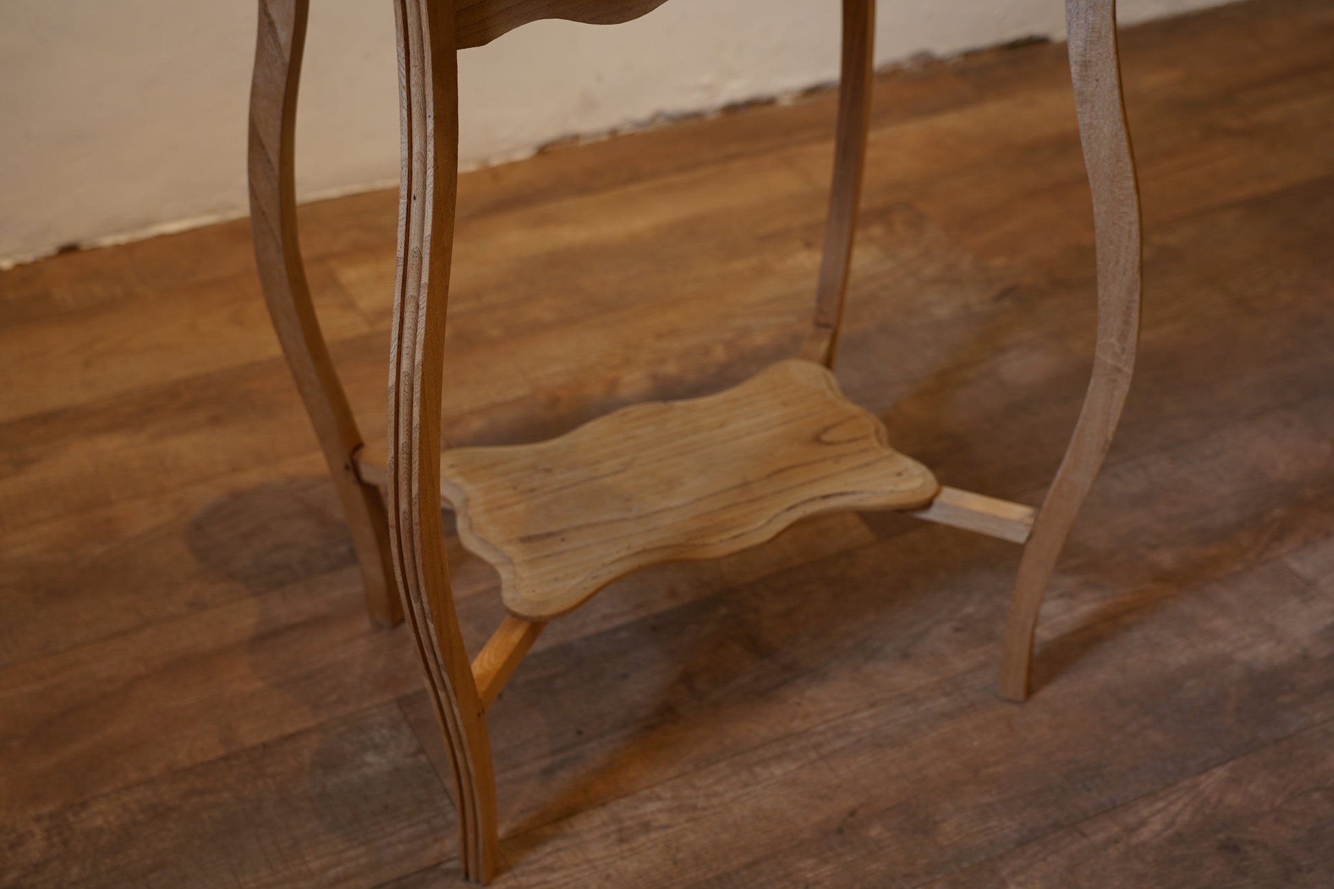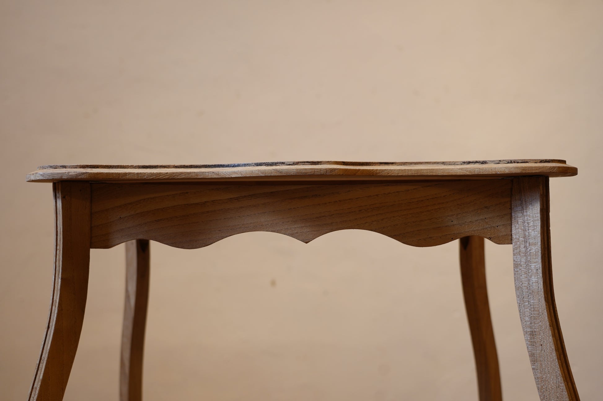 フランスアンティークらしい花リムの天板や、ふっくらと丸みのある足のデザインなど意匠を凝らした一品です。