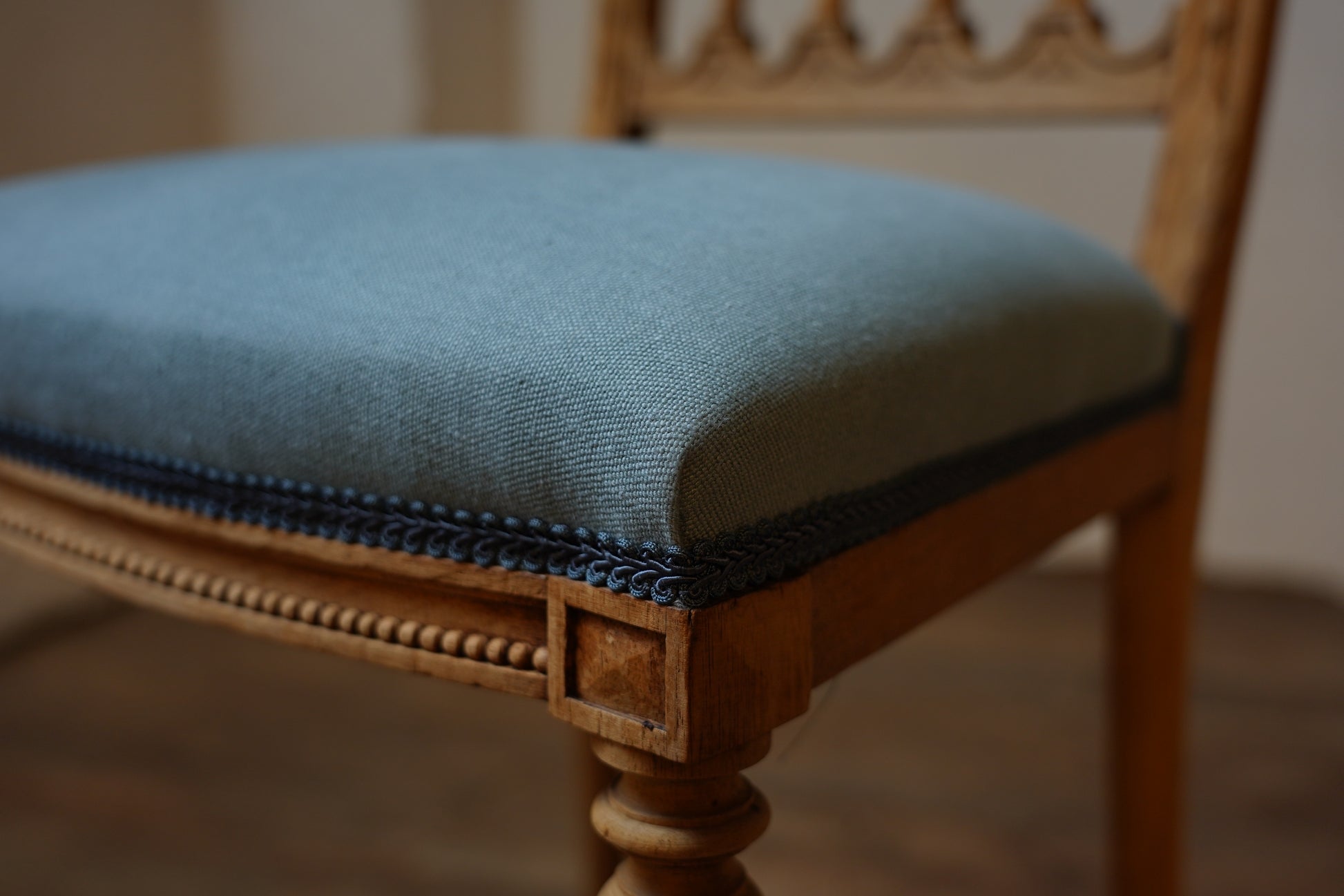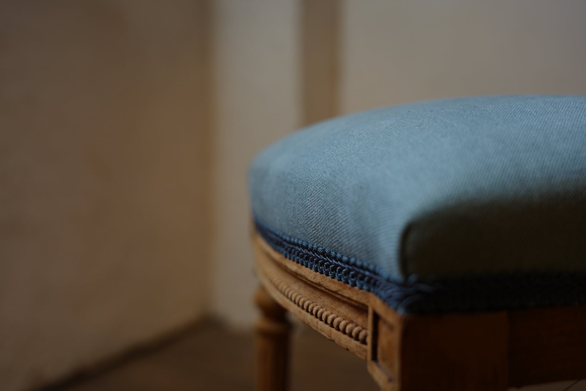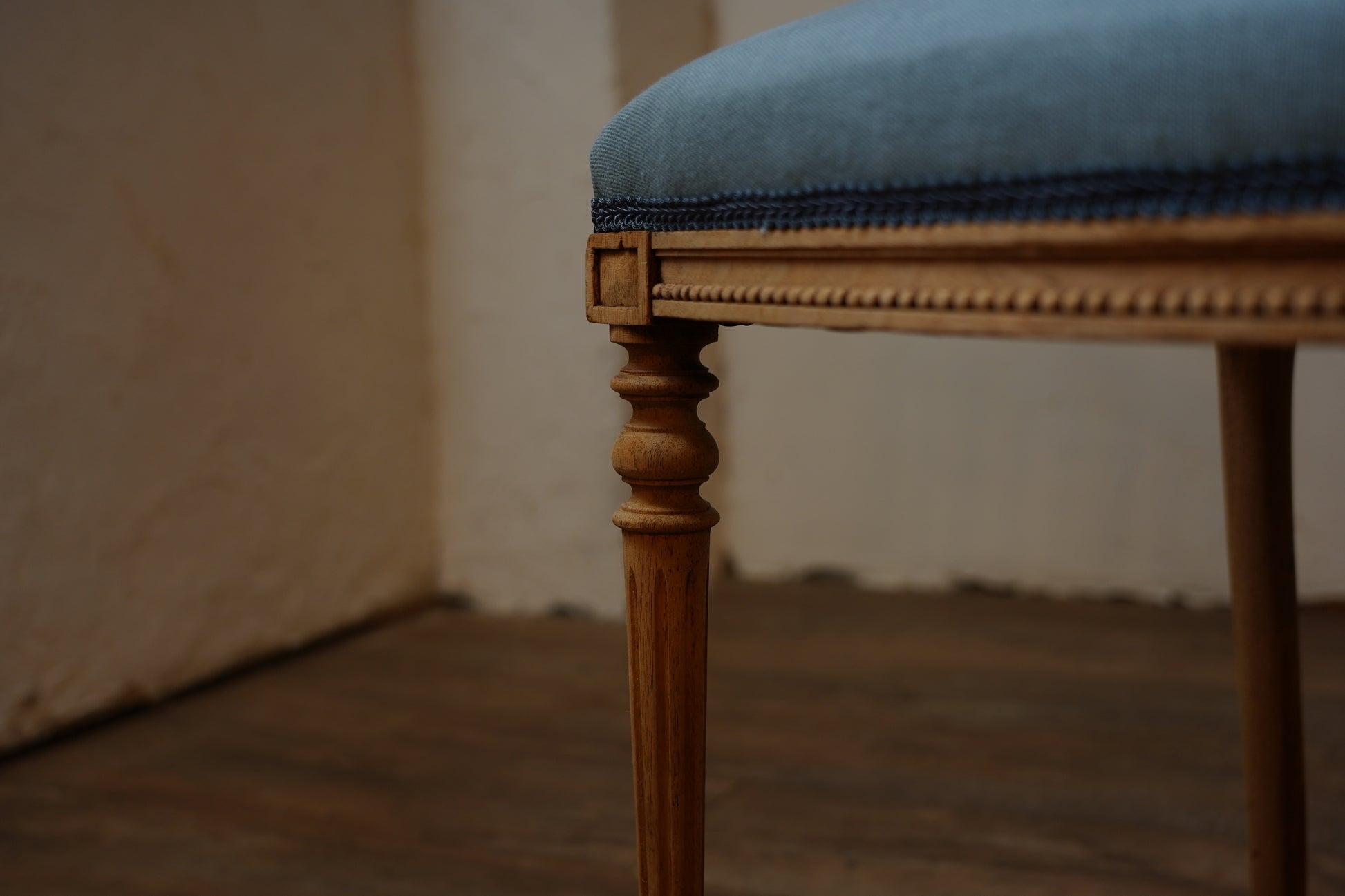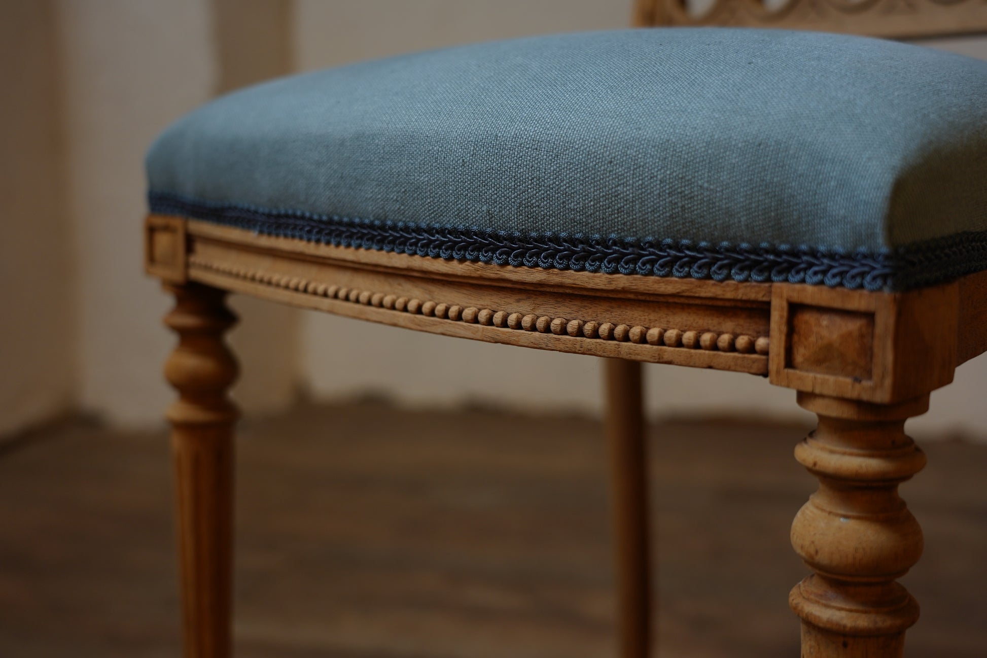 剥離された木の色合いと爽やかな青色がベストマッチな一脚。