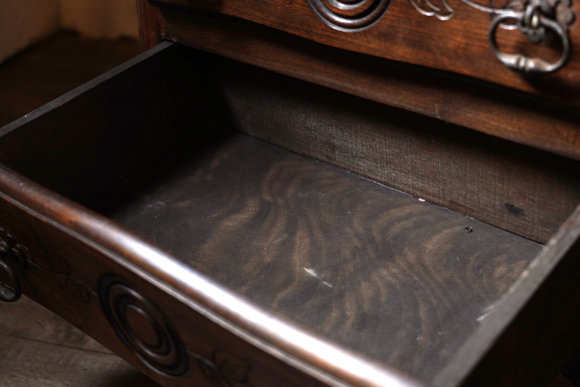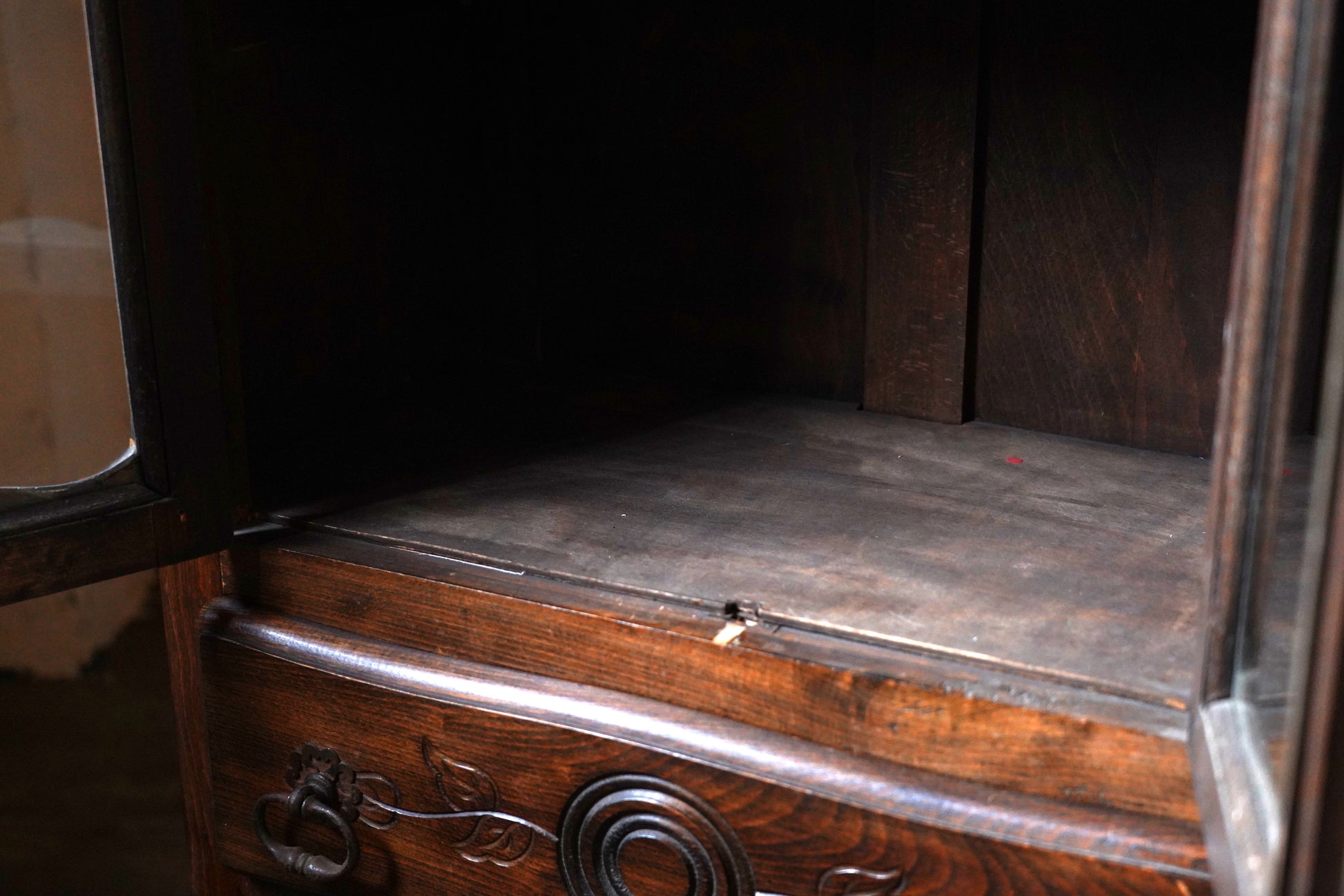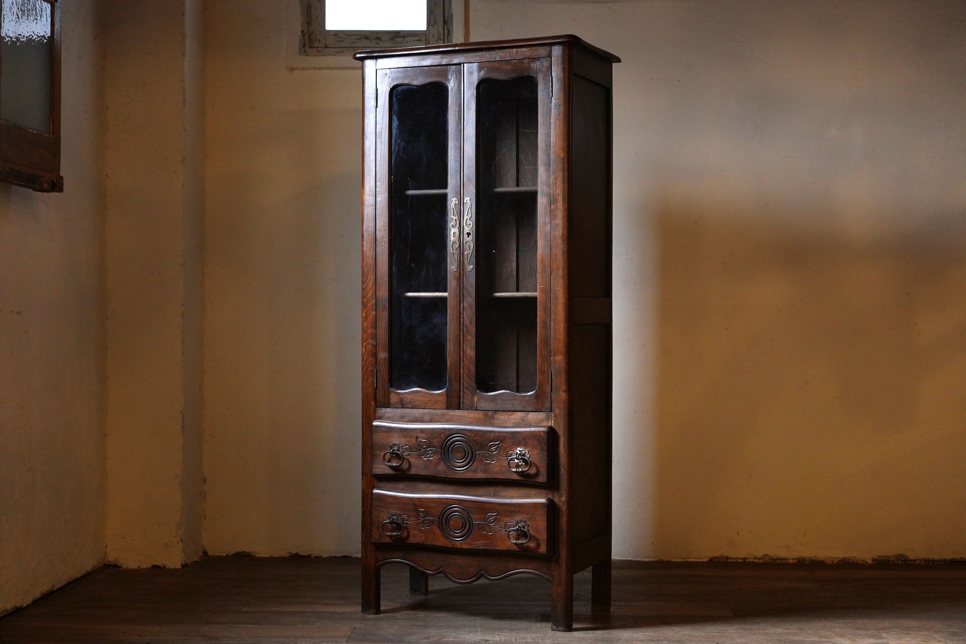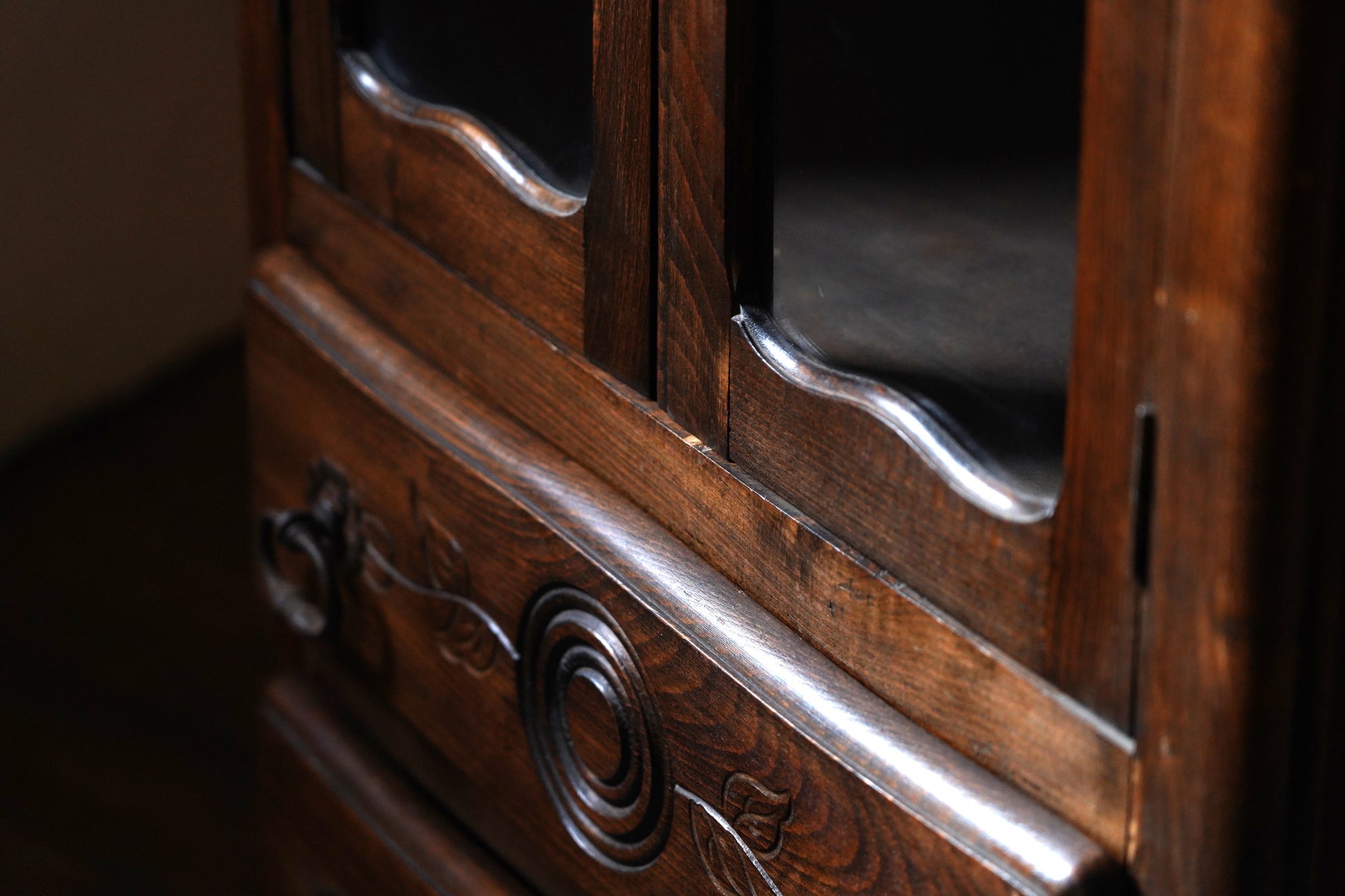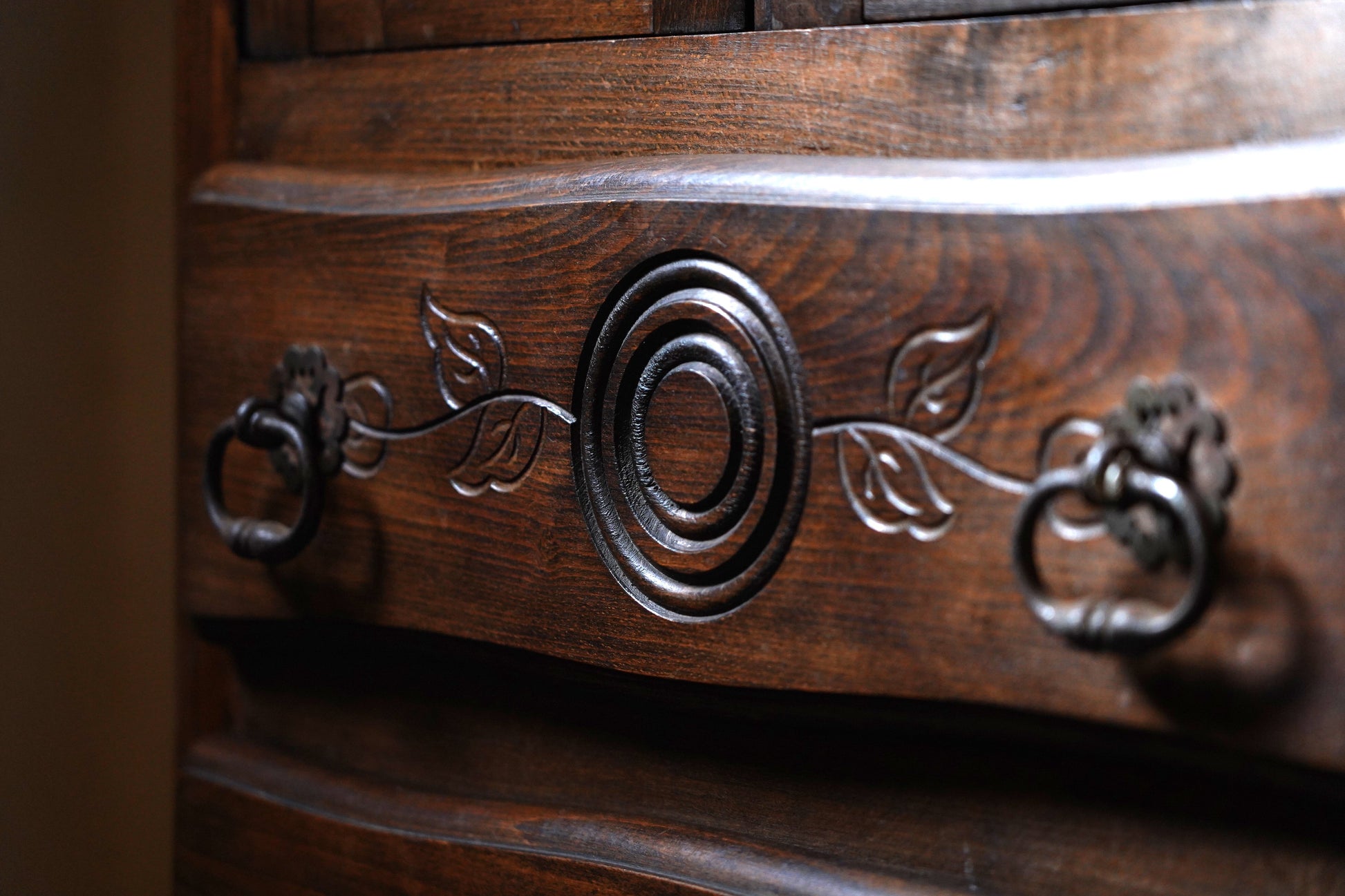 葉っぱの彫り模様や取っ手の装飾など細部にデザインがされており、派手過ぎずシンプル過ぎない温かみのあるデザインのキャビネットです。