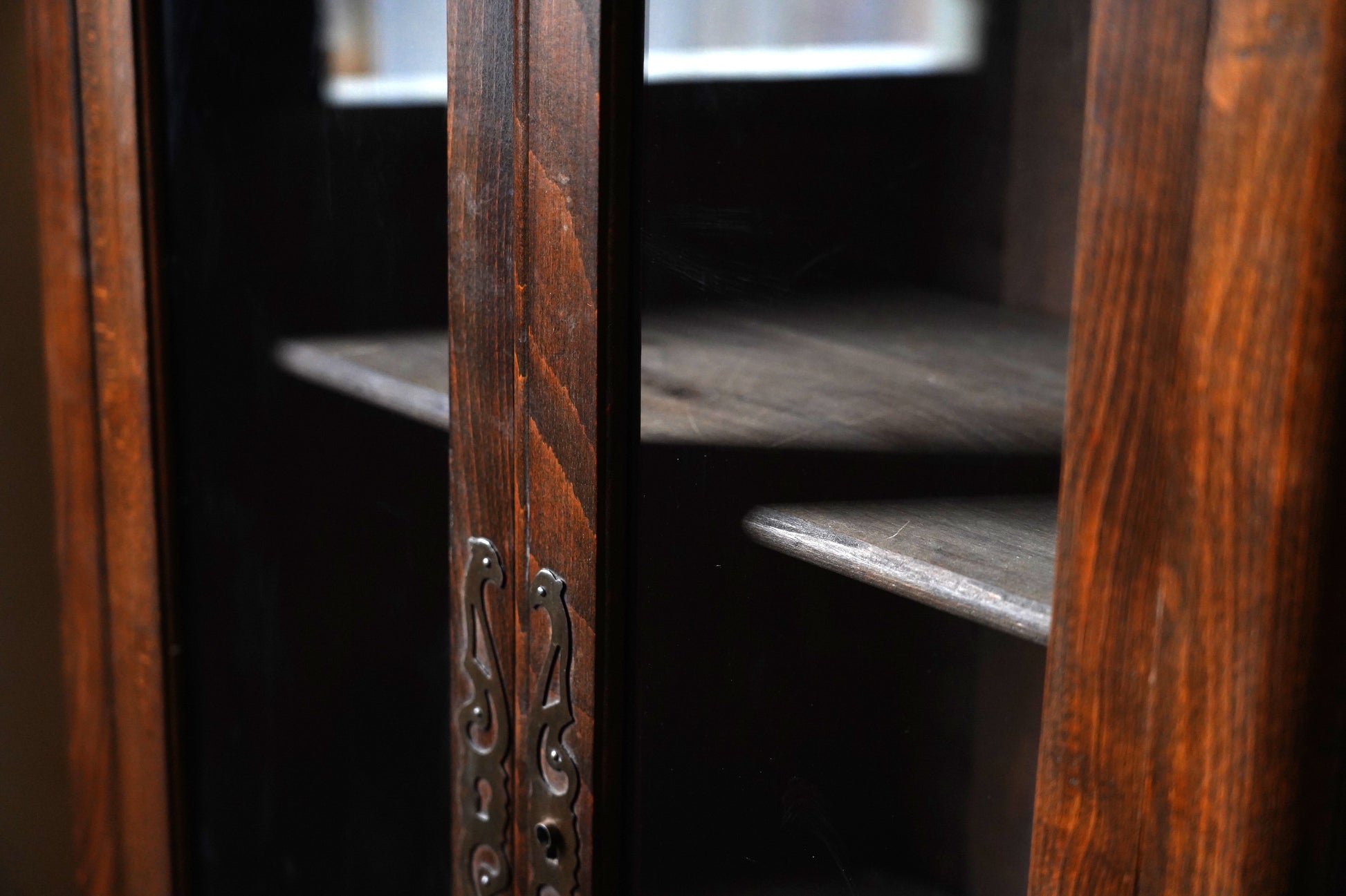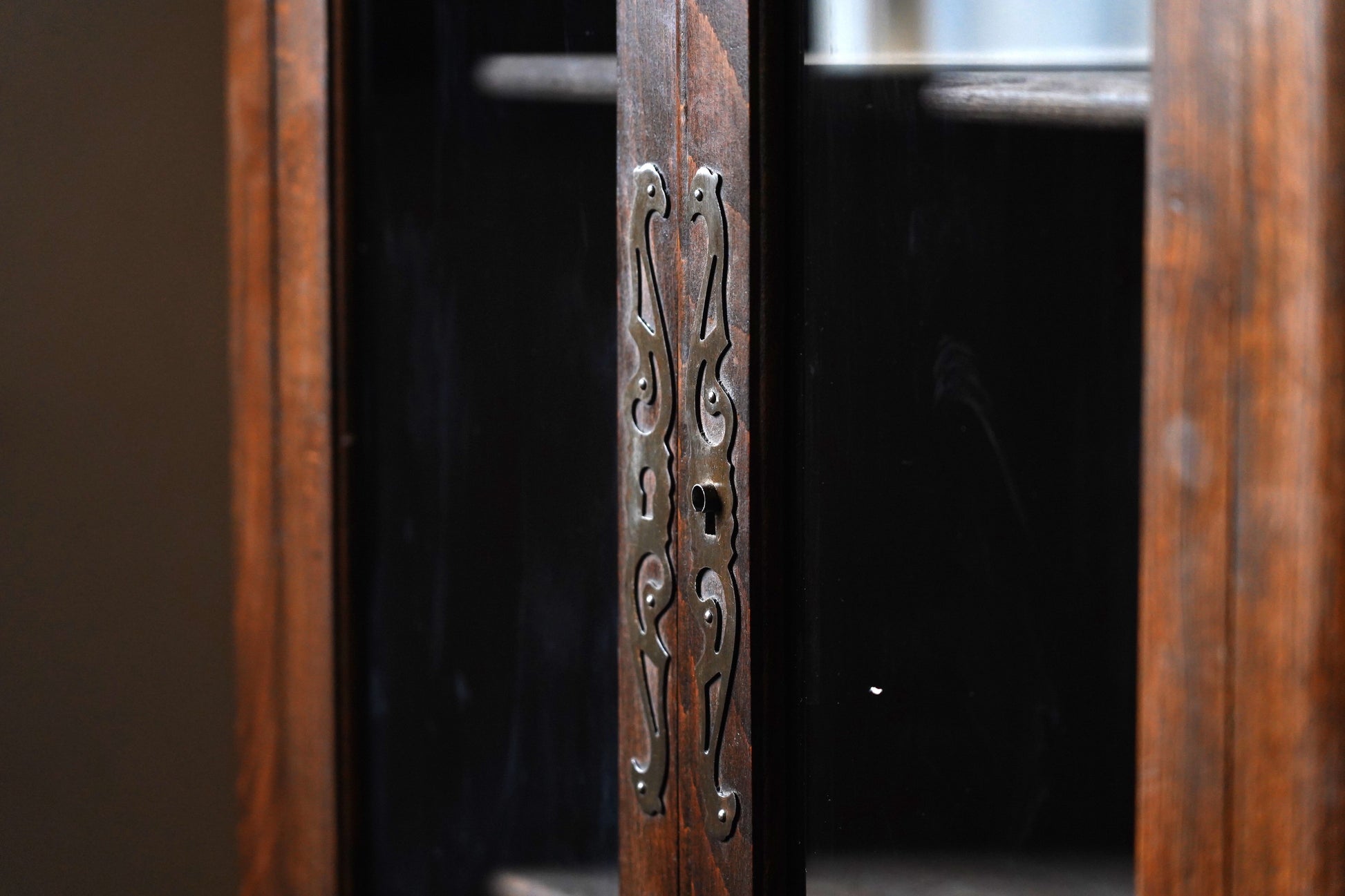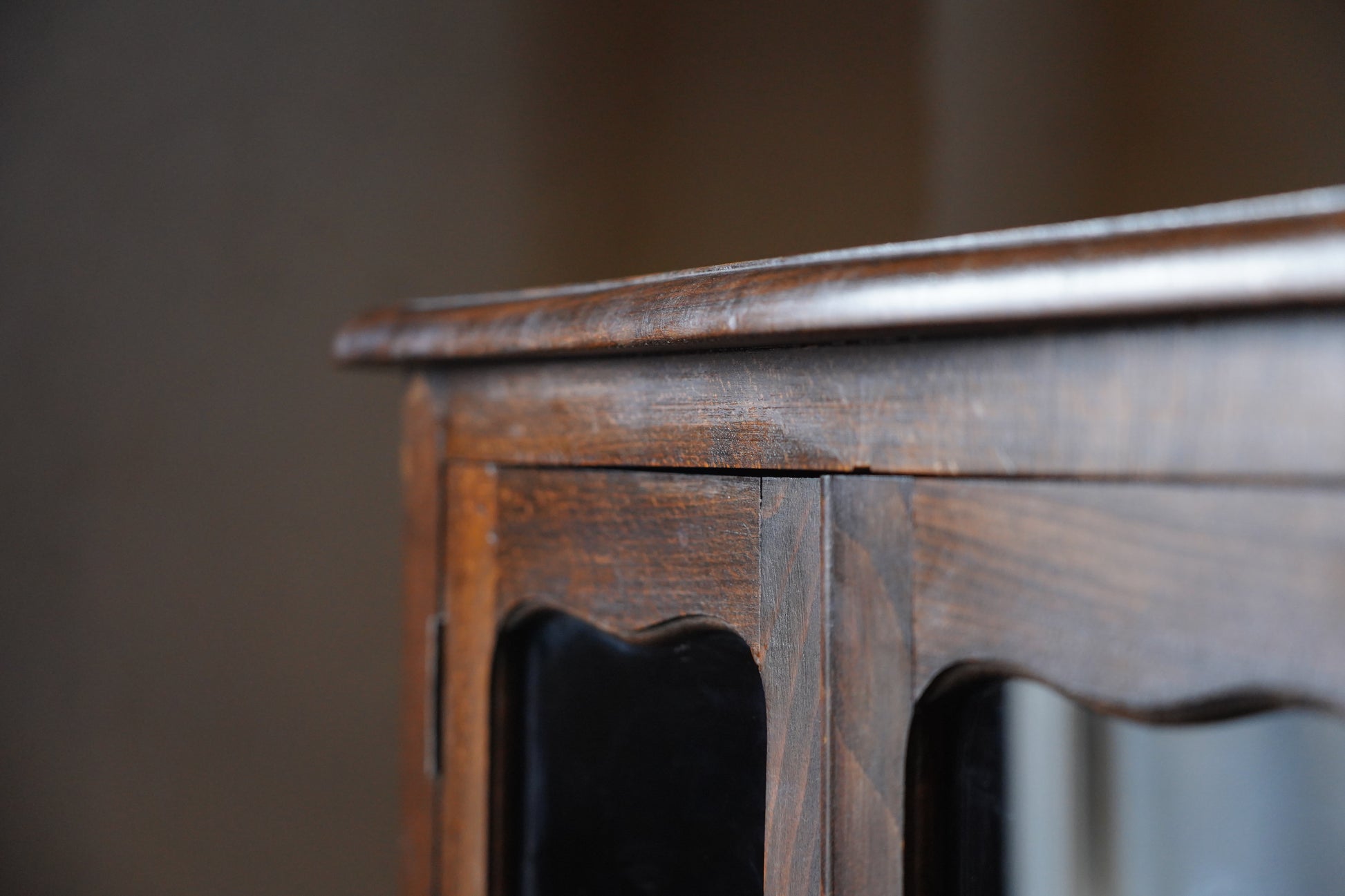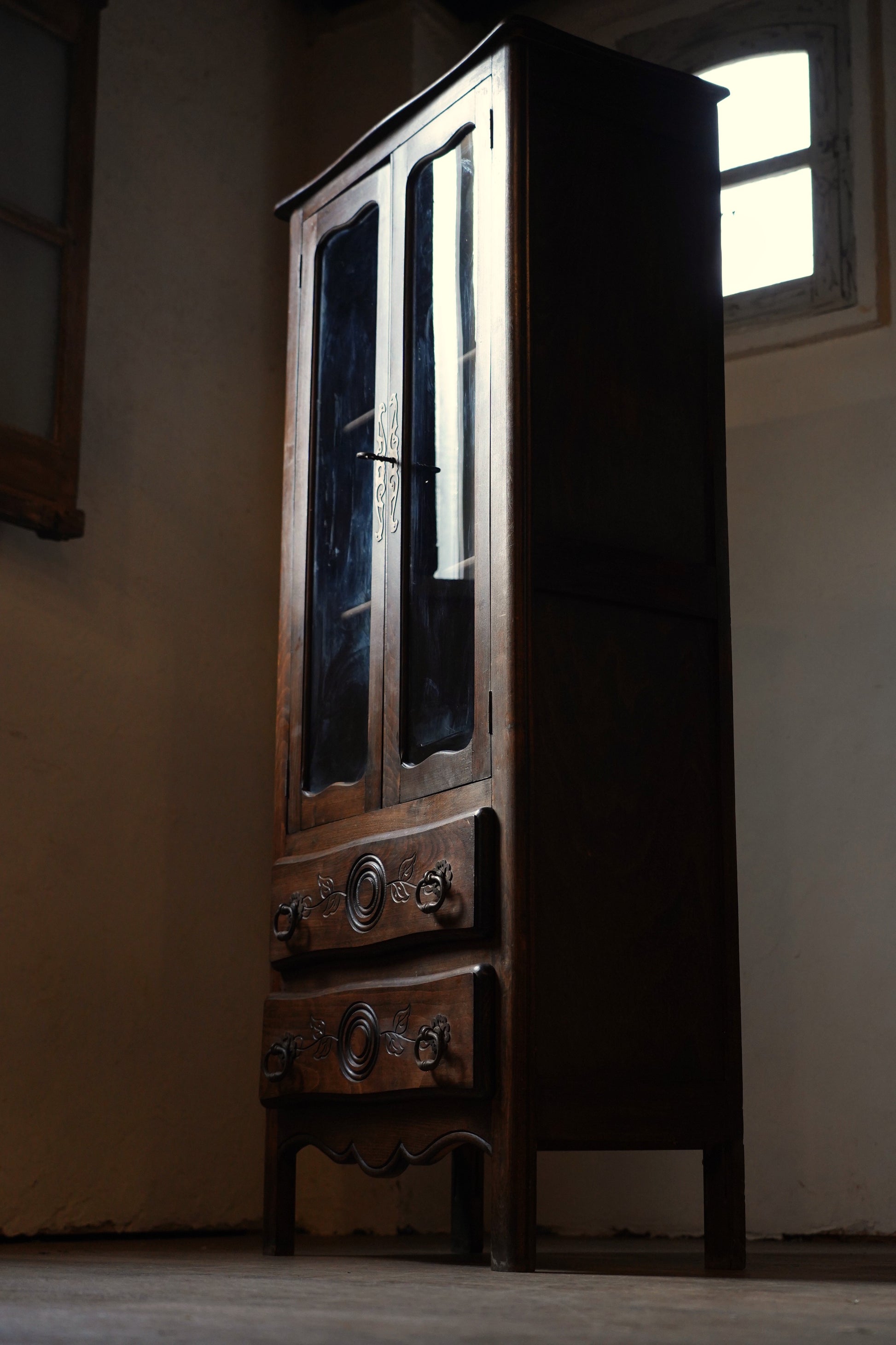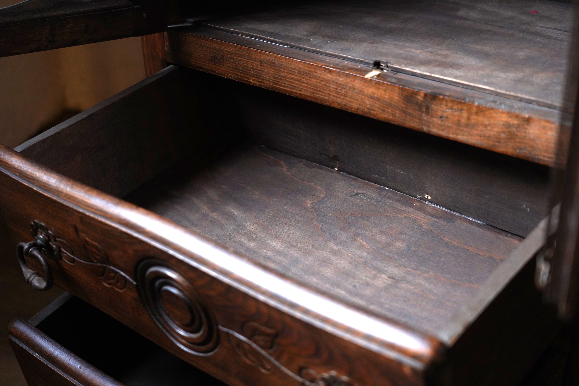 葉っぱの彫り模様や取っ手の装飾など細部にデザインがされており、派手過ぎずシンプル過ぎない温かみのあるデザインのキャビネットです。